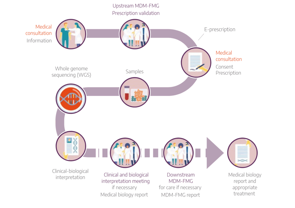 A working group led by the HAS is responsible for prioritising pre-indications for which patients can benefit from genomic sequencing during their care pathway (measure 6 of the PFMG2025). This working group also takes into account the technical constraints involved in sequencing and bioinformatic analysis of the results.