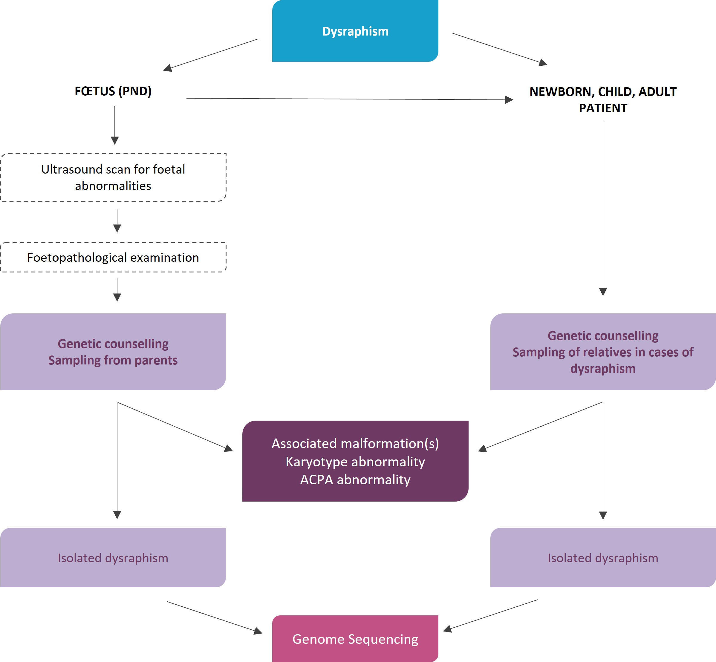 Paediatric, adult patients and fetuses  in cases of termination of pregnancy with open or closed dysraphisms with precise phenotypic characterisation: