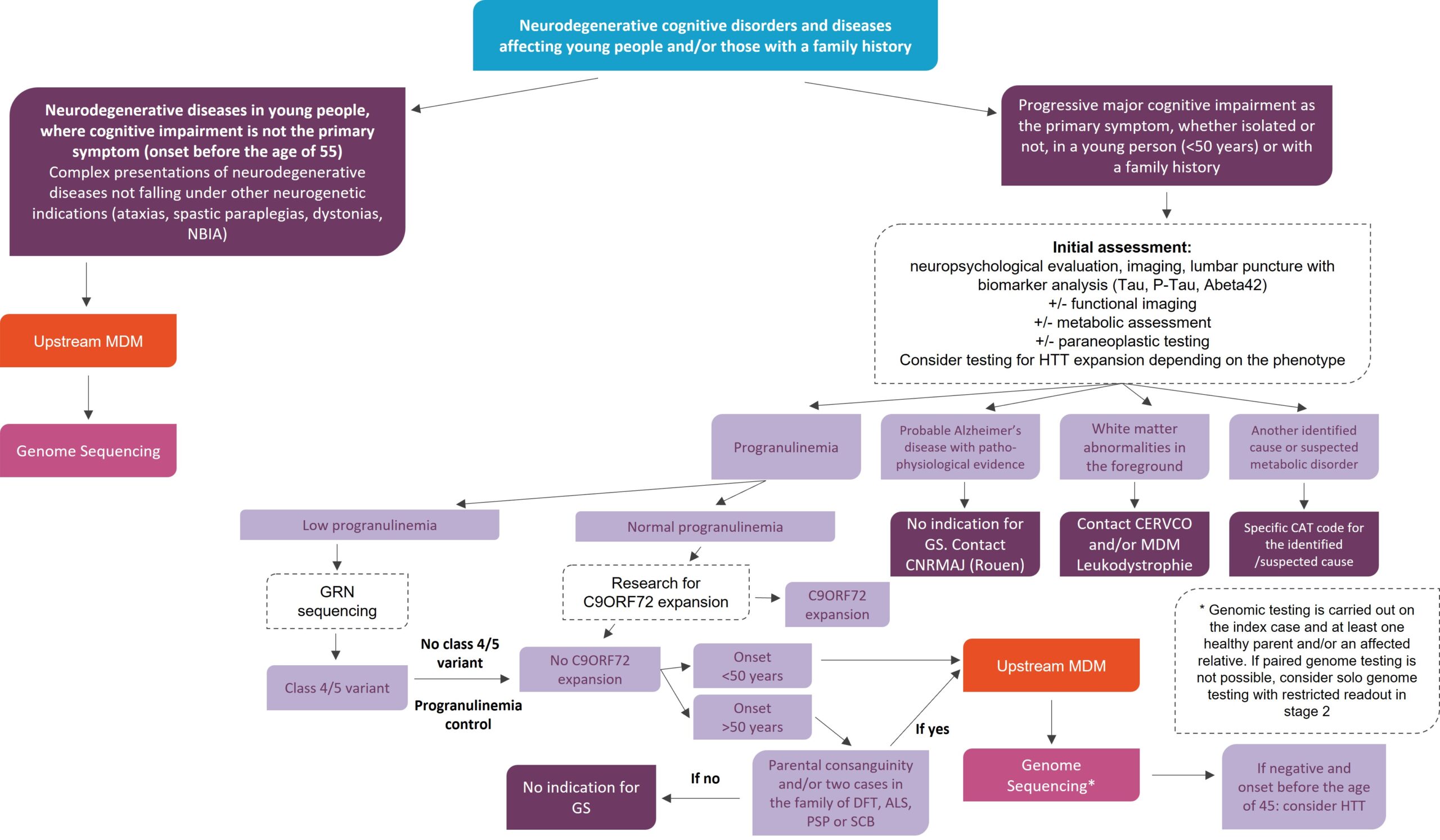 Genome sequencing is considered in cases of normal progranulin levels, absence of C9ORF72 expansion, and in patients with symptom onset before the age of 50 or, if onset after the age of 50, in cases of parental consanguinity and/or two cases in the family in the FTD/ALS/PSP/CBD spectrum.