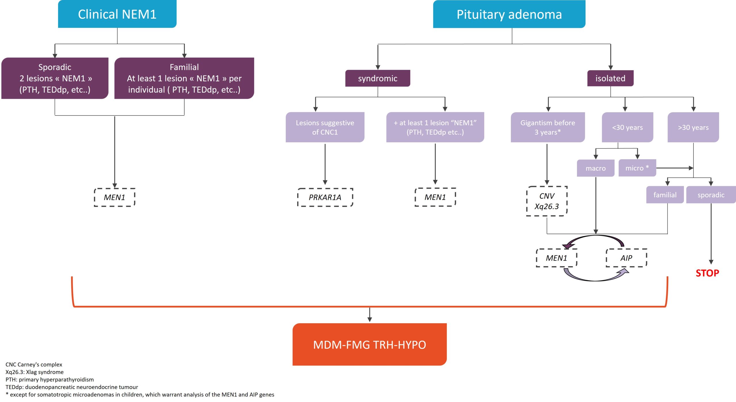 – Either sporadic index cases with at least two endocrine lesions falling within the NET1 spectrum: hyperparathyroidism, duodenopancreatic neuroendocrine lesions, pituitary adenomas, thymic or pulmonary neuroendocrine lesions