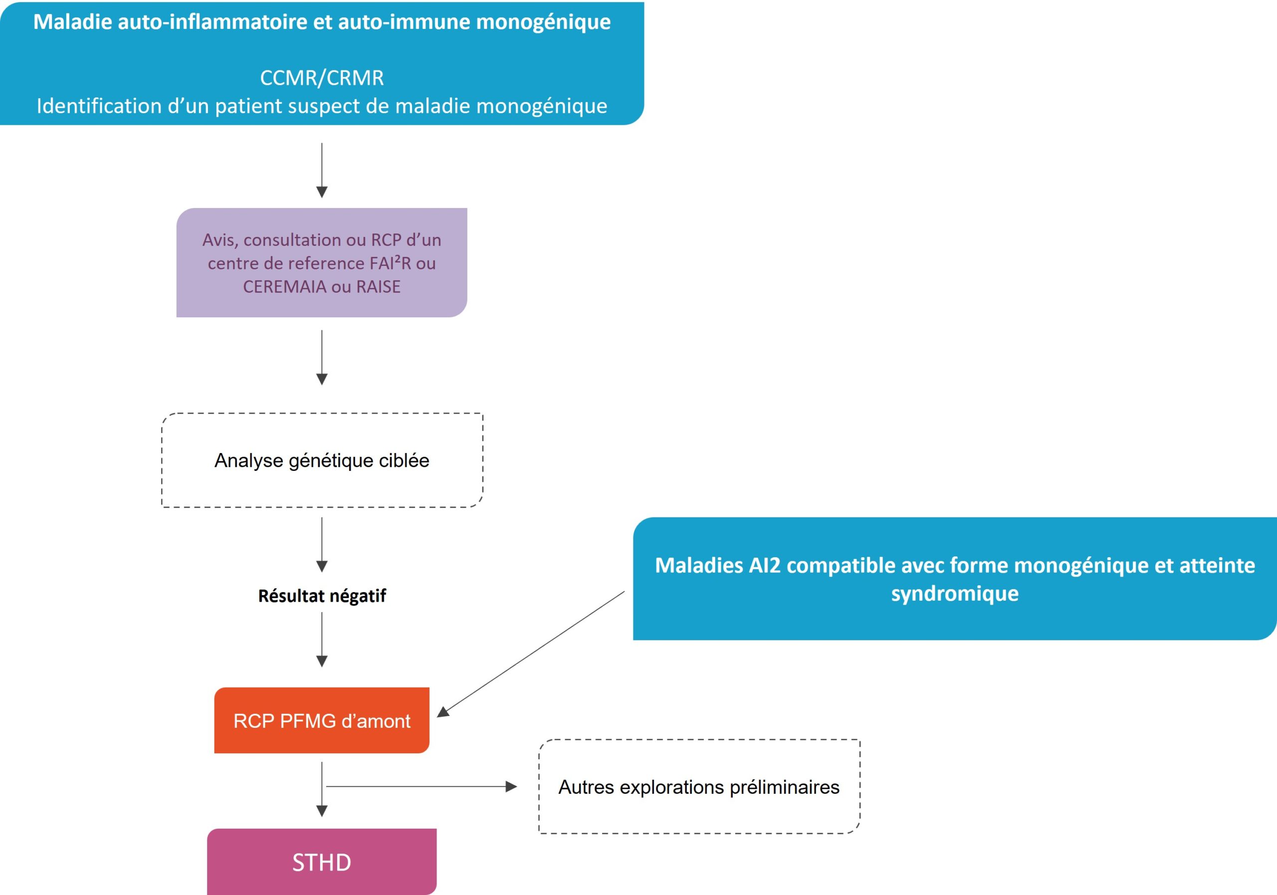 Pour les patients présentant des éléments en faveur d’une maladie auto-immune ou auto-inflammatoire monogénique, discutés lors des RCP nationales FAI²R (ou celles des CRMR CEREMAIA ou RAISE) et pour lesquels les analyses génétiques proposées ne sont pas contributives, un séquençage de l’ensemble du génome (Whole Genome Sequencing, WGS) avec analyse en trio pourra être proposé.